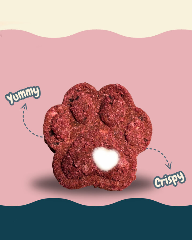 Lean beef, oat flour, beef bone broth, egg, organic coconut flour, fresh beetroot, beet powder, goat milk powder.